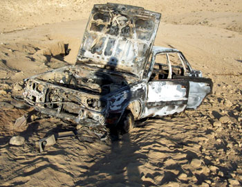 We walked about 50 meters away and waited, hoping that the jeep would leave and we could go back to the car. I saw the three soldiers break the rear window. One soldier open the engine hood, sprayed something flammable on the spare tire and set fire to it. The tire caught fire and exploded, and then the fire went out. The soldiers punctured all the tires on the car and broke the front window. It lasted about forty minutes. Then they got into the jeep and left."
