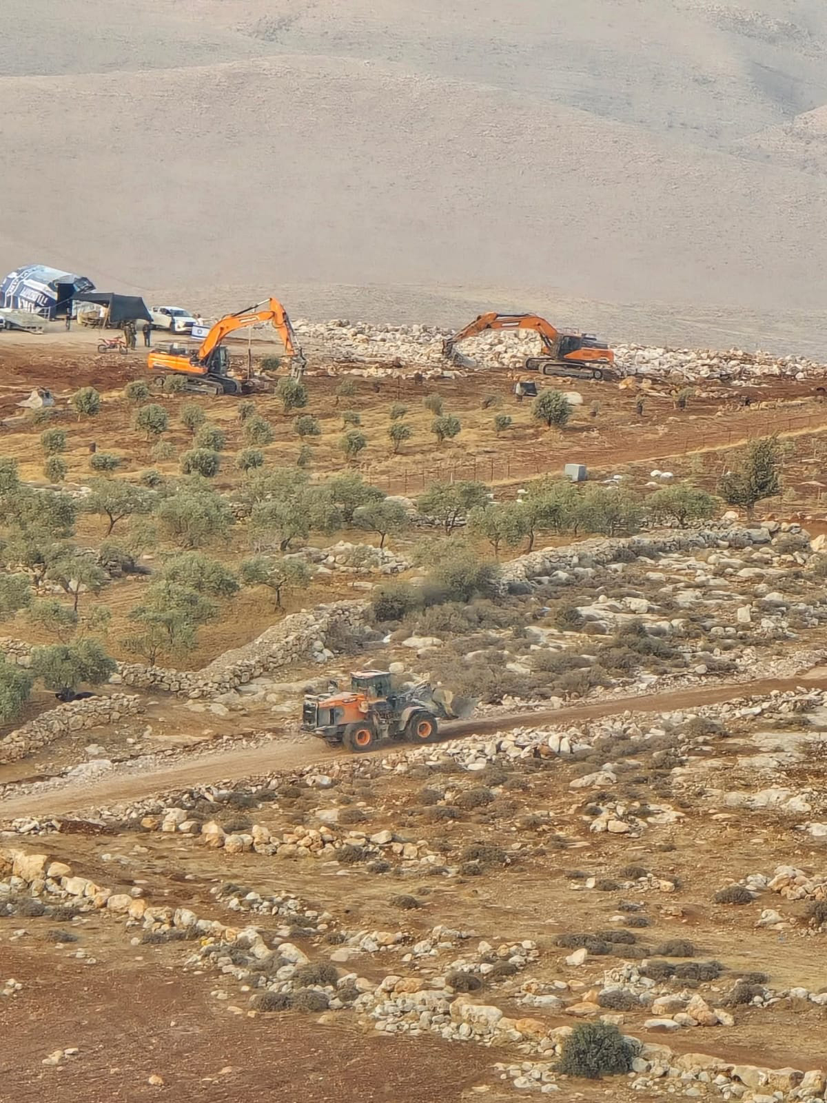 جرافة تابعةللمستوطنين تشقالطرق في أراضي القرية. صورة قدمها السكان مشكورين