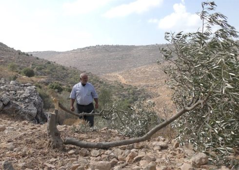 شاكر التميمي، وفي الخلفيّة كرم الزيتون خاصّته - بعد أن وجد أنّ مستوطنين قطفوا ثمار جميع الأشجار في كرمه. شرق الخليل، 17.10. تصوير منال الجعبري، بتسيلم.