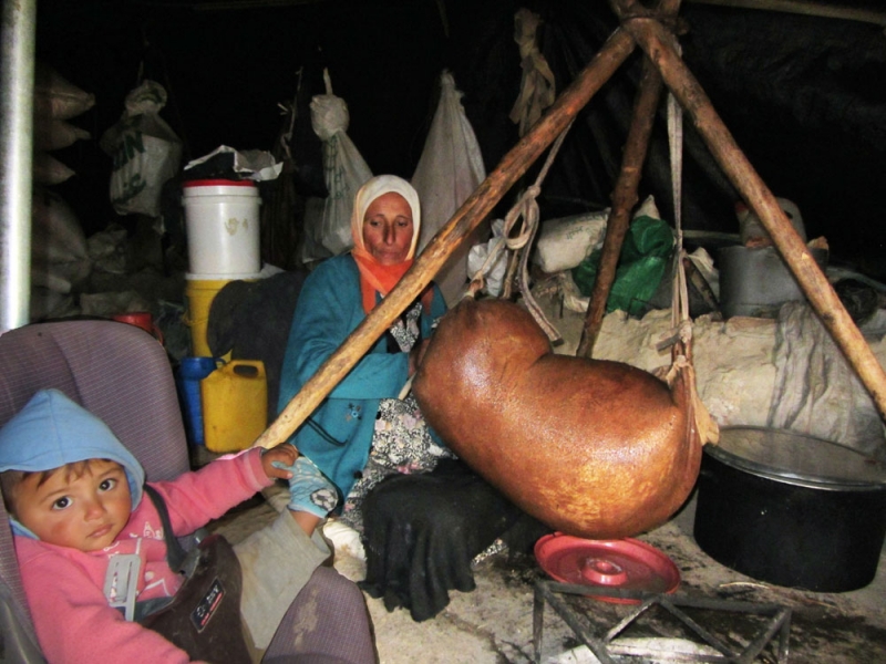 حليمة أبو عرام تصنع الزبدة في الخيمة، تصوير: نصر النواجعة، بتسيلم. 6/2/2013.