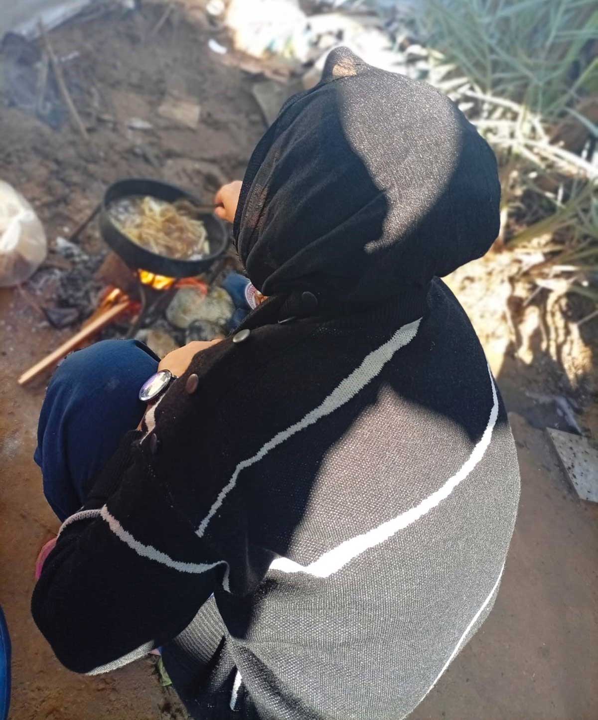 في 6.5.24، عندما شرع الجيش الإسرائيليّ في اجتياح مدينة رفح، هربنا من هناك مع أكثر من مليون شخص، سكّان رفح ومهجرين، ورُحنا نبحث مجدّداً عن مكان "آمن". توجّهنا إلى منطقة البركسات - مخازن وكالة الغوث، غربيّ مدينة رفح، لكنّنا لم نمكث هناك سوى تسعة أيّام، لأنّ القصف والقتل لحقا بنا إلى هناك. وحيث لم يكن في رفح حتى متر مربّع آمن، قرّر زوجي أن نذهب إلى مواصي خان يونس، كملجأ مؤقت. لم تكن معنا خيمة ولم نجد مكاناً نلجأ إليه. فرشنا بطّانيّات على الرّمال والتحفنا السّماء. مكثنا هناك 12 يوماً في ظروف لا ترحم. كنّا ننام على الرّمال، نرتجف من البرد في اللّيل، نحترق من الحرّ في النهار، متروكين عُرضة لأحوال الطقس وأنظار الجميع. كلّ هذا كان ممزوجاً بالخوف والرّعب في كلّ لحظة.