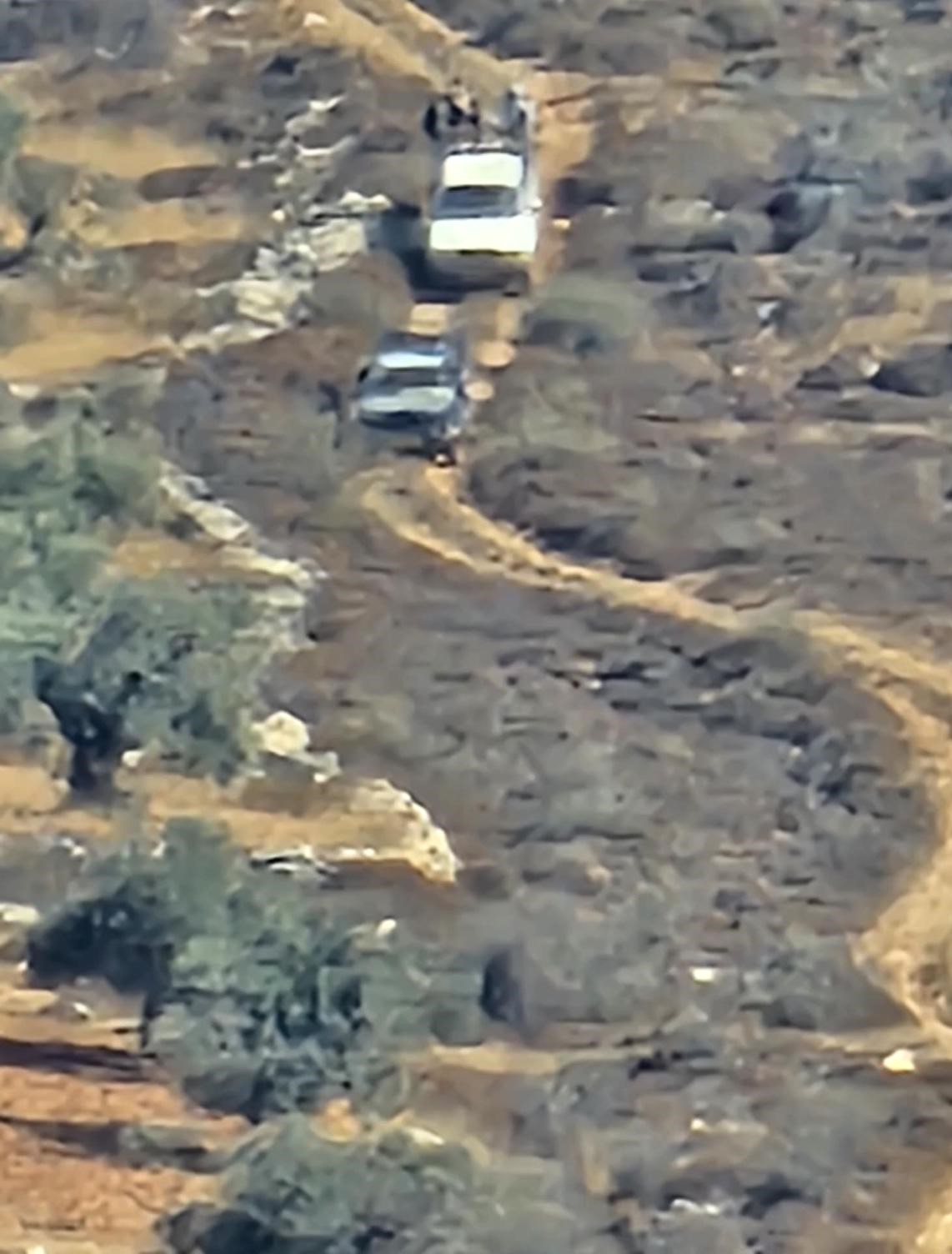 לאחר שהרחיקו את המתנחלים מהאזור, החיילים הורו לנו לעזוב מייד את המקום, אבל ראינו ששני המתנחלים החמושים עדיין עומדים בתחילת דרך העפר, במרחק של 20-15 מטרים מהמקום שבו חנו הרכבים שלנו. אמרתי לחיילים שאנחנו רוצים לצאת עם הרכבים ולחזור הביתה, ואנחנו צריכים שהם יאבטחו לנו את הדרך בשביל זה. הבן שלי מוחמד נכנס למושב הנהג במקום בעלי, שהיד כאבה לו מאד ובעלי ואני גם נכנסנו לרכב. גיסתי והבן שלה גם עלו לרכב שלהם, והתכוננו לחזור הביתה והפעילים נשארו בשטח. כשהגענו לתחילת דרך העפר, שני המתנחלים החמושים חסמו לנו את הדרך ומנעו מאיתנו לנסוע. הם אמרו לצבא שאין לרכבים שלנו רישיון ואז החיילים אמרו לנו שאנחנו צריכים לחכות עד שהמשטרה תגיע ותברר אם הרכבים חוקיים. הם עיכבו אותנו במשך 30-25 דקות, עד ששני רכבי משטרה הגיעו ומהם ירדו שני שוטרים. השוטרים הורו לנו להישאר ברכבים שלנו וביקשו מאיתנו את מסמכי הרכבים אבל לא היו לנו כאלה.