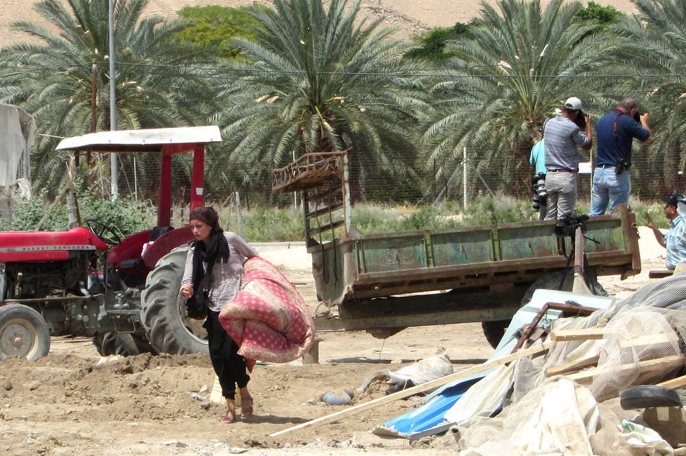 Many soldiers, big tractors, police and cars blocked off the lands around us. They ordered us to get our belongings out of our homes, and in less than half an hour they demolished everything. They left nothing. The little children and the lambs stood in the sun or under trees. All our personal belongings were outside, and the tractors scraped through and destroyed all our structures. They left no stone unturned. They left us no roof to shelter under. We were left outside with nothing. They even destroyed the stone oven I use to bake bread for the children. I asked them to leave it for us so we could eat, but it was like talking to a wall.