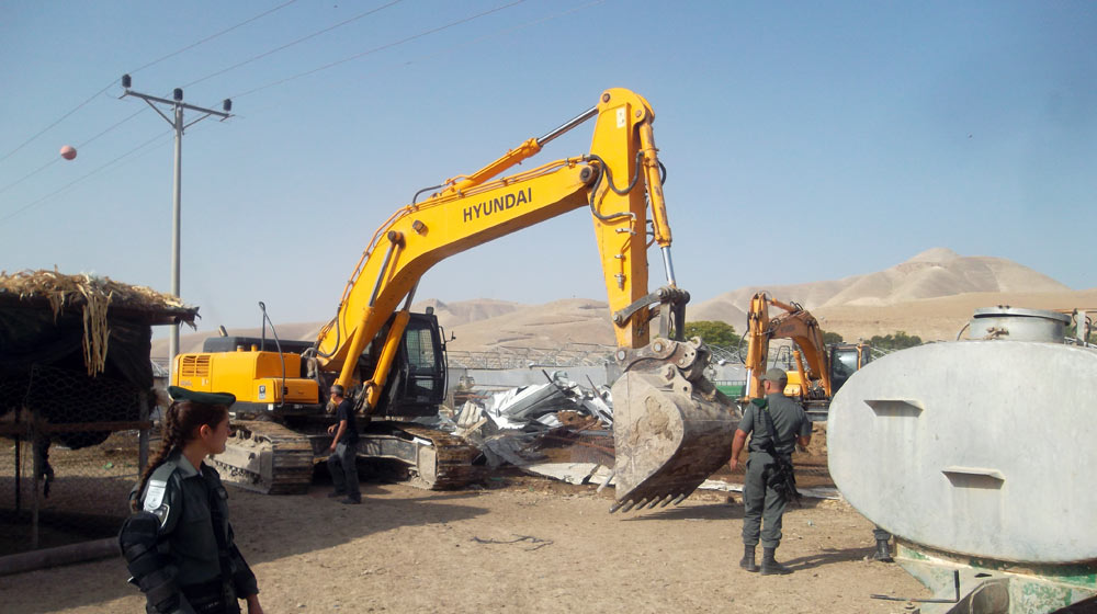 On the morning of 21 May 2014, five Civil Administration bulldozers accompanied by a considerable force of military and Border Police personnel arrived at the Palestinian community of Id’eis. Located near the village of al-Jiftlik in the Jordan Valley, Id’eis consists of 23 families living in two neighboring compounds. The southern compound is home to 10 families – a total of 53 individuals, including 28 children – living in 14 tents. These families own approximately 4,500 sheep and goats, housed in some 25 structures. The troops approached the southern compound and informed its residents they have half an hour to gather all their belongings before all tents and structures would be demolished. After the time was up, the bulldozers proceeded to raze the 14 living tents and 25 livestock structures. They also damaged roughly 45 meters of pipes that carry water to the community from a nearby well, which was undergoing repair. The short notice did not leave the residents enough time to take most of the livestock gear and feed from the pens, so they were nearly all ruined.