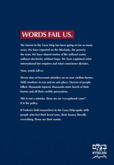 B'Tselem issued a position paper detailing the guidelines of the necessary Israeli investigation of its conduct during the operation in Gaza. B'Tselem's initial survey of the military operation calls into question Israeli statements that the military acted according to International Humanitarian Law and that responsibility for the harm to the civilian population rests exclusively with Hamas.