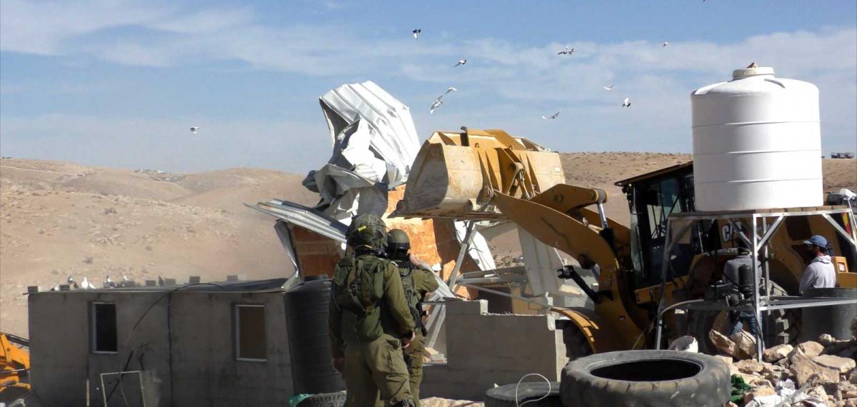 On Wednesday, 12 January 2021, at around 9:00 A.M., Civil Administration personnel came with a military and Border Police escort and equipped with bulldozers to the Palestinian community of Khirbet al-Fakhit in Masafer Yatta, South Hebron Hills. The forces demolished nine structures, including three housing units inhabited by three families from the same extended family, leaving 18 people, including 11 minors, homeless. The demolition was carried out by the power of demolition orders delivered on 21 February 2016. The other demolished structures, belonging to the same family, included three livestock enclosures, a livestock pen, a kitchen, and fodder storage and a cistern in the family’s land.